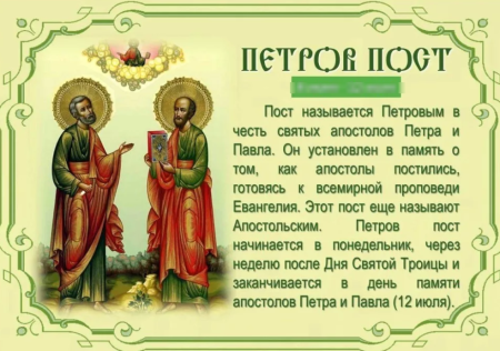 По традиции Петров пост начинается через неделю после праздника Святой Троицы (Пятидесятницы), дата которого зависит от дня празднования Пасхи. Завершается же он всегда днем памяти апостолов Петра и Павла 12 июля. В связи с этим длительность Петрова поста всегда разная – от 8 до 42 дней.