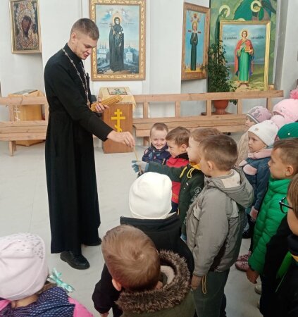 Батюшка познакомил дошкольников не только с правилами поведения в церкви, но также интересно рассказывал деткам о церковных свечах и убранстве храма, говорил о любви и доброте.