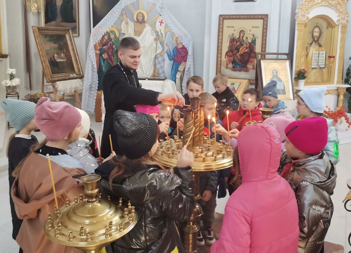Мальчишки и девчонки задавали вопросы о свечах, сами их зажигали и учились ставить в подсвечники. Когда батюшка рассказывал об иконах и о том, кто на них изображен, ребята тоже обращались с Господу Богу и Богородице, учились креститься перед ликами святых.