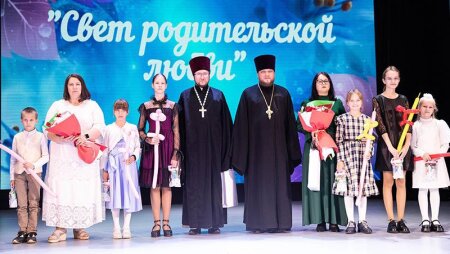 – С огромным удовольствием приглашаем на сцену многодетную семью благочинного Клецкого церковного округа иерея Евшеля Андрея Михайловича, матушку Юлию Александровну и дочерей Варвару, Веру, Ксению. Любовь, доверие друг к другу, общие взгляды на жизнь, общие планы и мечты – главные достижения этой замечательной семьи. Андрей Михайлович, Юлия Александровна, примите самые искренние поздравления с праздником!
