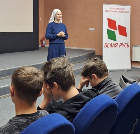 После показа состоялось обсуждение картины. Перед учащимися колледжа выступили благочинный Клецкого церковного округа иерей Андрей Евшель и старшая сестра милосердия сестричества в честь святой блаженной Валентины Миснкой прихода храма Воскресения Христова г.Клецка Татьяна Костюкевич, начальник отдела ЗАГС Ольга Рудко Клецкого райисполкома, врач-психотерапевт и психолог Клецкой ЦРБ Алина Крижик и Анна Игнатчик.