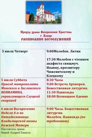 Расписание Богослужений 30 июнь 2025, Понедельник 218 0 0 1 2 3 4 5 Обсудить Материалы по теме: Читайте также: 24 декабрь 2022, Суббота Расписание Богослужений в Воскресенском храме 03 март 2023, Пятница Расписание Богослужений в храме Воскресения Христова г.Клецка в МАРТЕ 23 апрель 2025, Среда Расписание Богослужений 15 декабрь 2022, Четверг Храм Воскресения Христова г. Клецка 16 январь 2023, Понедельник Вода на Клецком озере будет освящаться 19 января в 14.00 Добавить комментарий Комментарии (0) Прокомментировать Введите код с картинки: Отправить