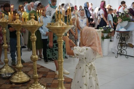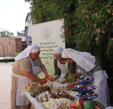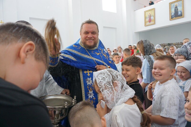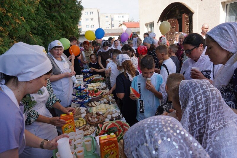 Именно в последнее летнее воскресенье для ребят устраивается на территории храма праздник. Сегодня отец настоятель вместе с сестрами милосердия сестричества в честь святой блаженной Валентины Минской также приготовили для юных клетчан стол со сладостями и фруктами, соками и конфетами.