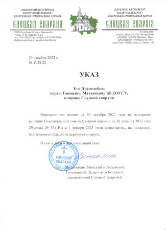 Соответствующий Указ подписал Митрополит Минский и Заславский, Патриарший Экзарх всея Беларуси, управляющий Слуцкой епархией Вениамин 30 декабря 2022 года.