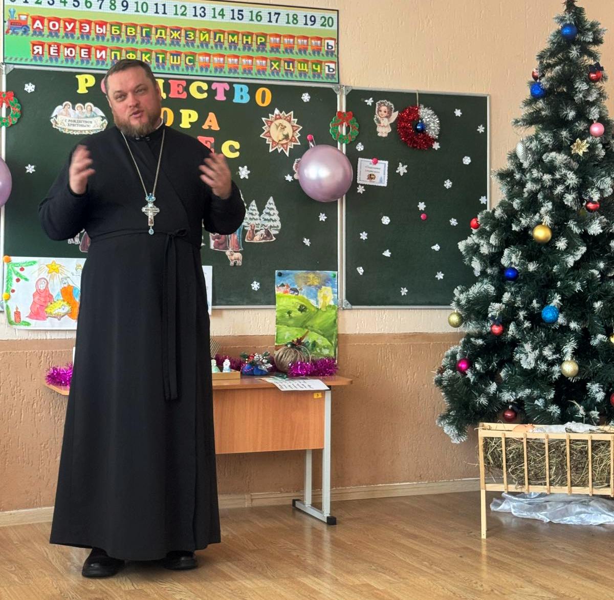 Школьный праздничный рождественский утренник посетил иерей Андрей Евшель.