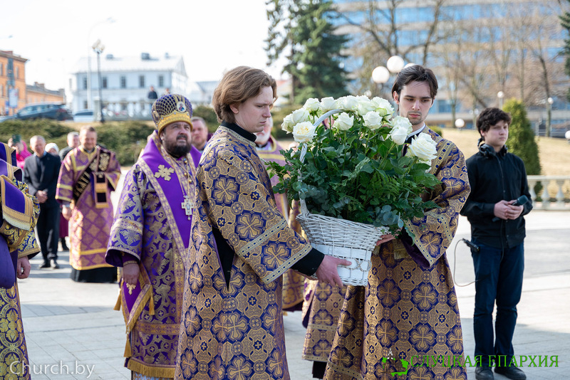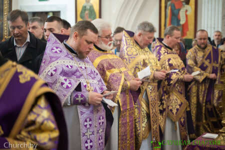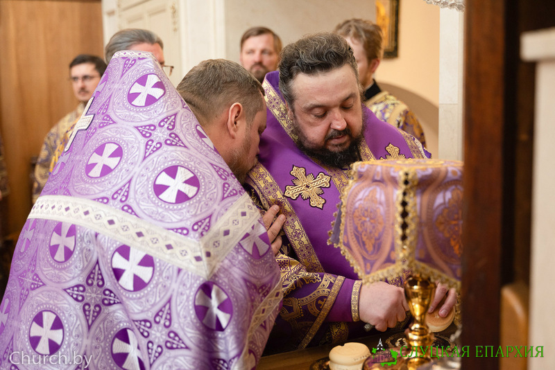 Его Преосвященству сослужили клирики собора и приглашённое духовенство, в том числе священнослужители Слуцкой епархии: благочинный Стародорожского церковного округа протоиерей Игорь Кручко и благочинный Клецкого церковного округа иерей Андрей Евшель.