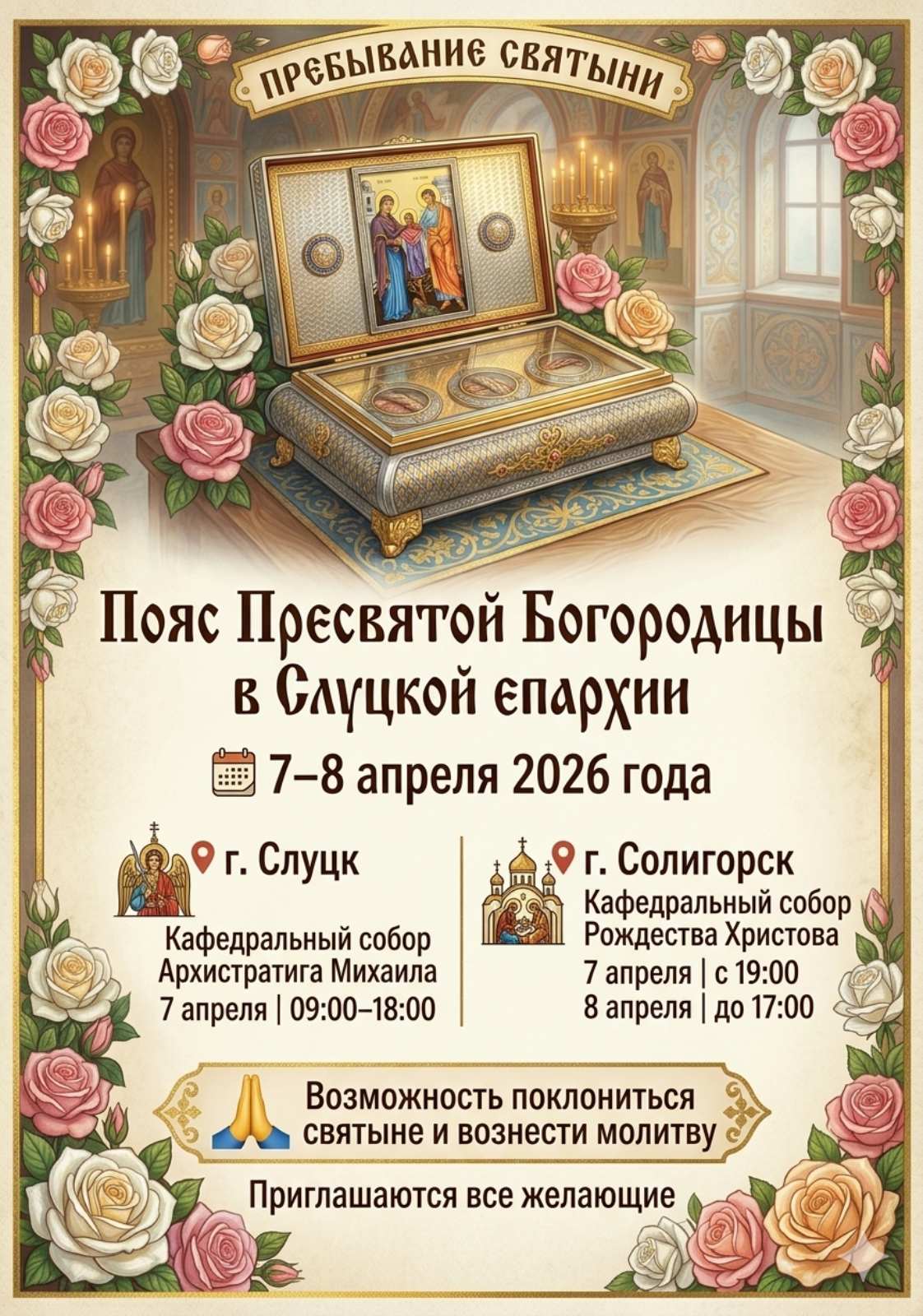 По благословению Митрополита Минского и Заславского Вениамина, Патриаршего Экзарха всея Беларуси, управляющего Слуцкой епархией, в пределы Слуцкой епархии 7-8 апреля 2026 года прибывает великая святыня – Пояс Пресвятой Богородицы.