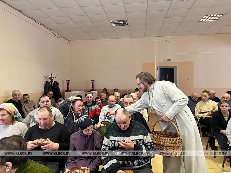 Особенно трепетно звучали приветственные «Христос Воскрес!» и «Воистину Воскрес!», после которых гости угощали куличами всех жителей учреждения. Те, кто находился в зале, получили пироги от ОО «Белая Русь», крашеные пасхальные яйца от священнослужителя.