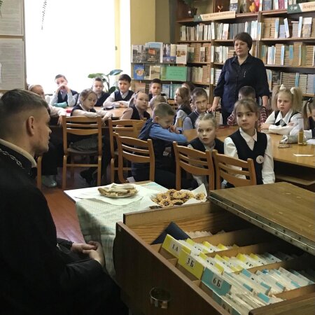 О Масленице говорил благочинный Клецкого церковного округа иерей Геннадий Белоус с учащимися младших классов