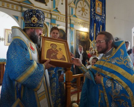 В ответном слове настоятель храма протоиерей Андрей Гладкий поблагодарил епископа Евсевия за визит и преподнес в дар писаную икону Смоленской иконы Божией Матери, именуемой "Одигитрия". По завершении службы, Его Преосвященство вручил награду алтарнику Покровского храма: медали Праведной княгини Софии Слуцкой удостоен за многолетние труды и личный вклад в развитие Церкви Иван Никитович Ильюкевич.