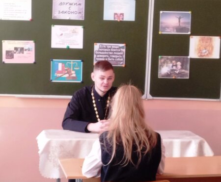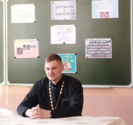 В рамках акции "Дружим с законом" в СШ №2 города Клецка с учащимися 8 класса беседовал благочинный Клецкого церковного округа иерей Геннадий Белоус.